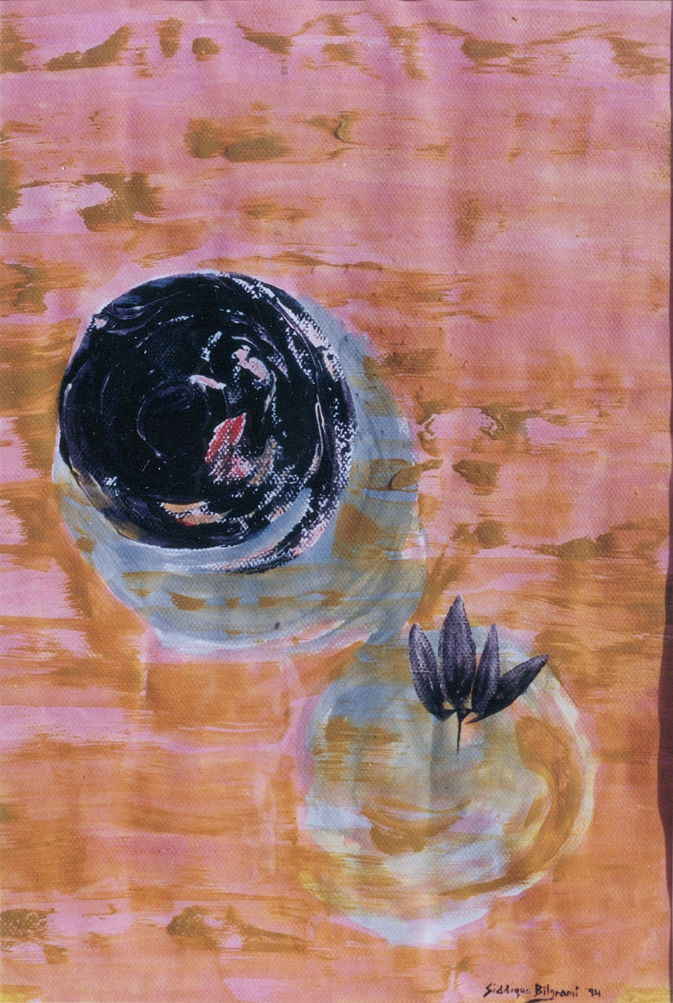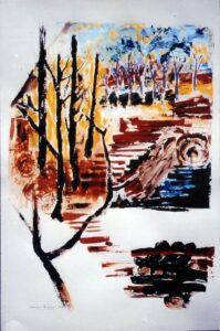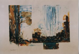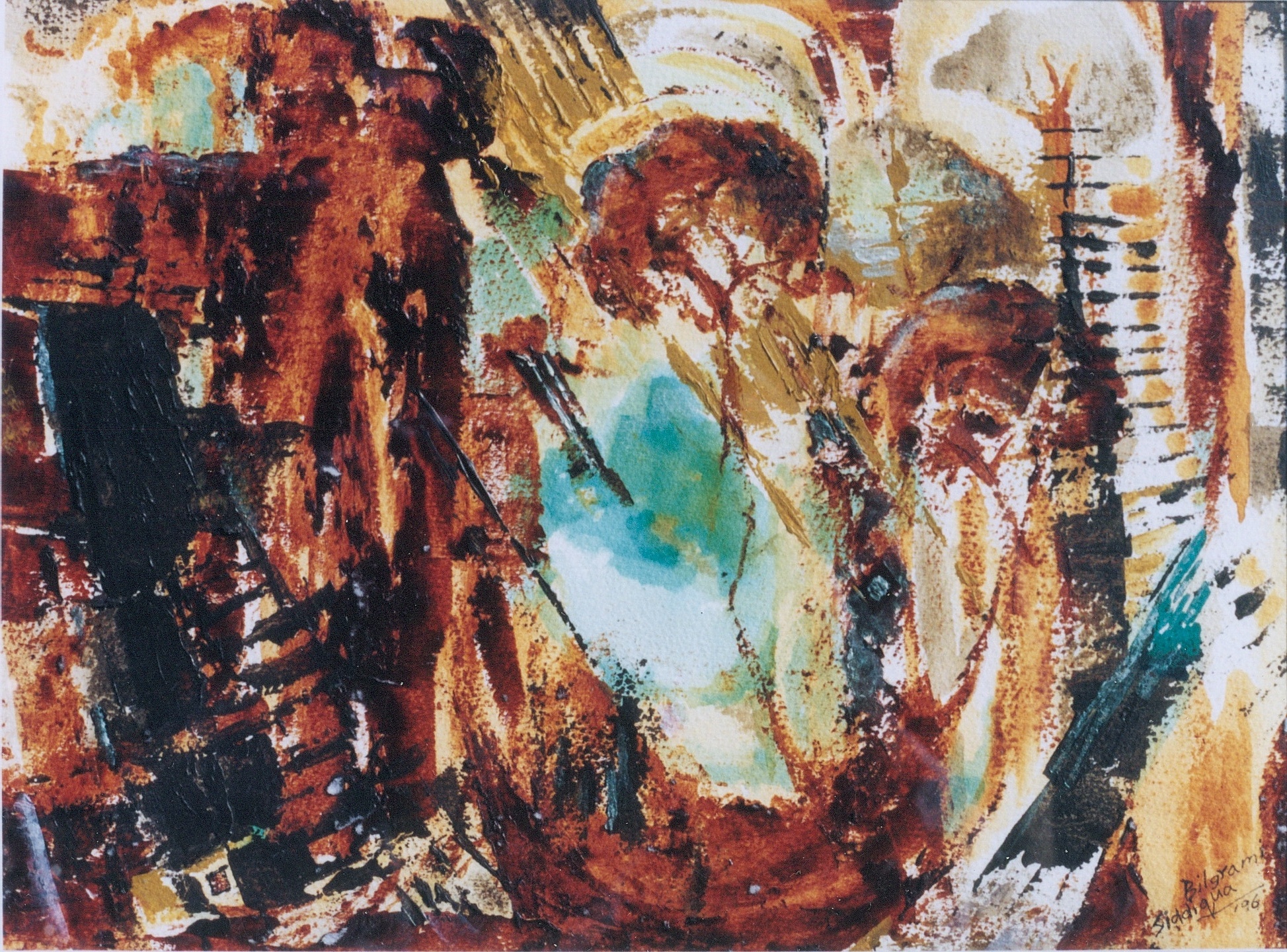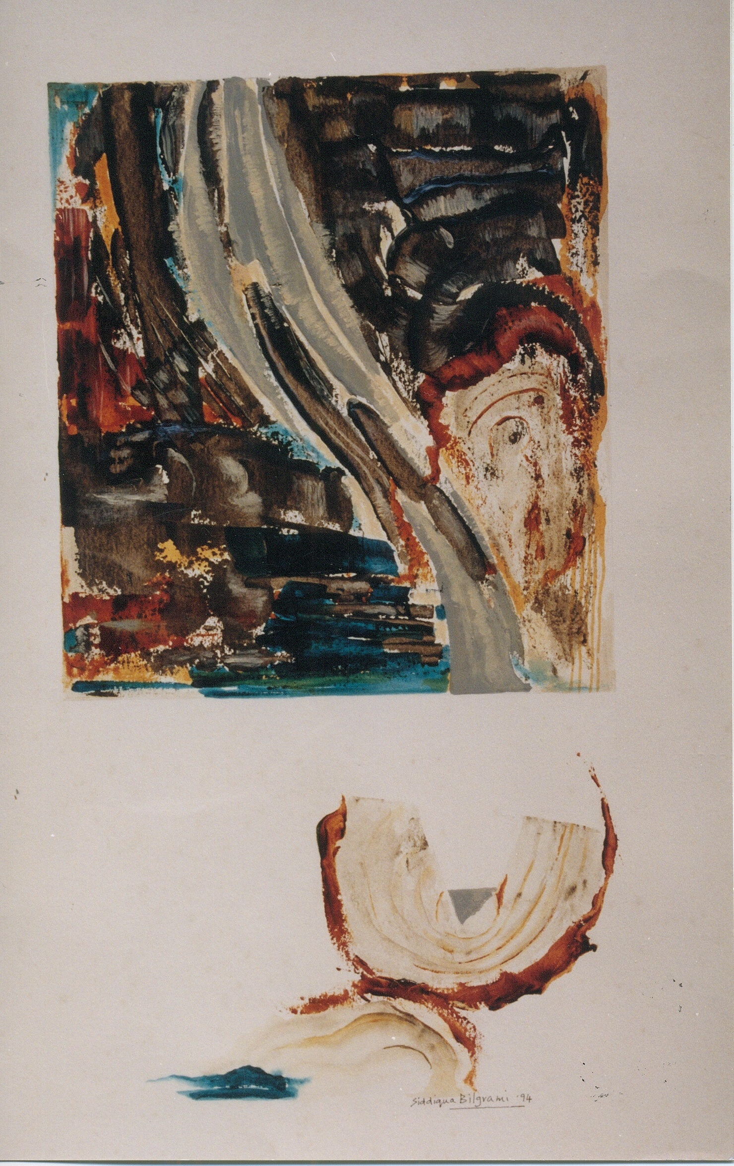 Seen and unseen, imagined and visualized, spring forth semi-abstract forms akin to landscapes. The ‘print’ format continued here, containing the imagery in self-imposed boundaries and then spilling out here and there for special effects. These paintings are in acrylics on paper. The subject matter varies from ‘ spiritualistic’ where ascending stairs and pathways lead one up somewhere, or there is an examination of ‘Nature’ by cross-section, front and side-views, leading onto a logical conclusion. Drops of blood, tears and strikes sometimes combine with landscapes. Sometimes there is poetic portrayal of Nature itself.