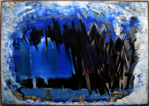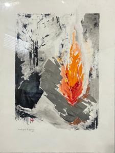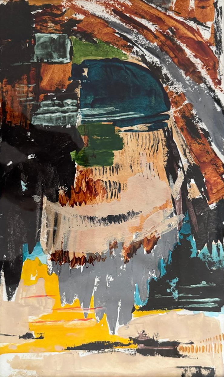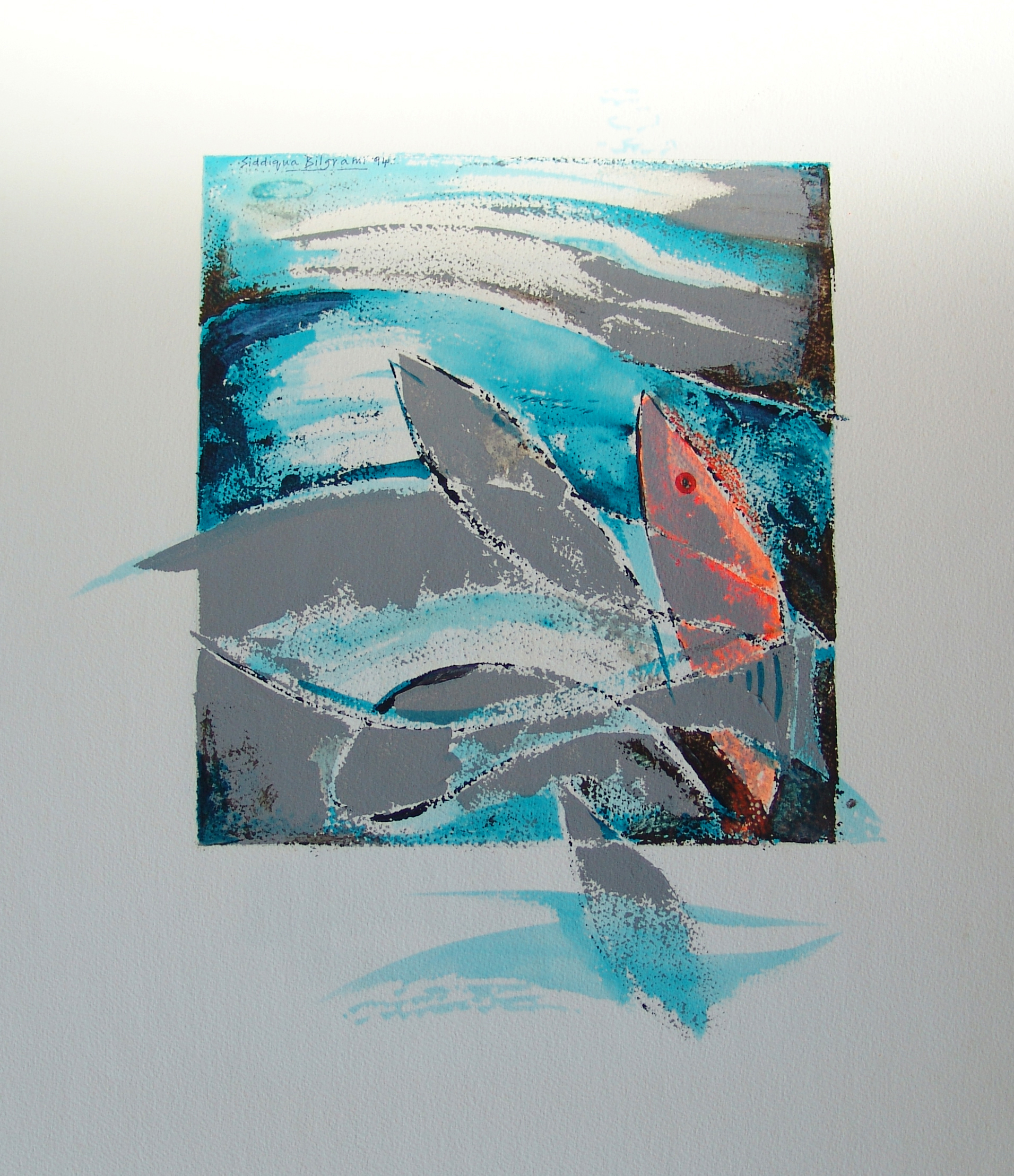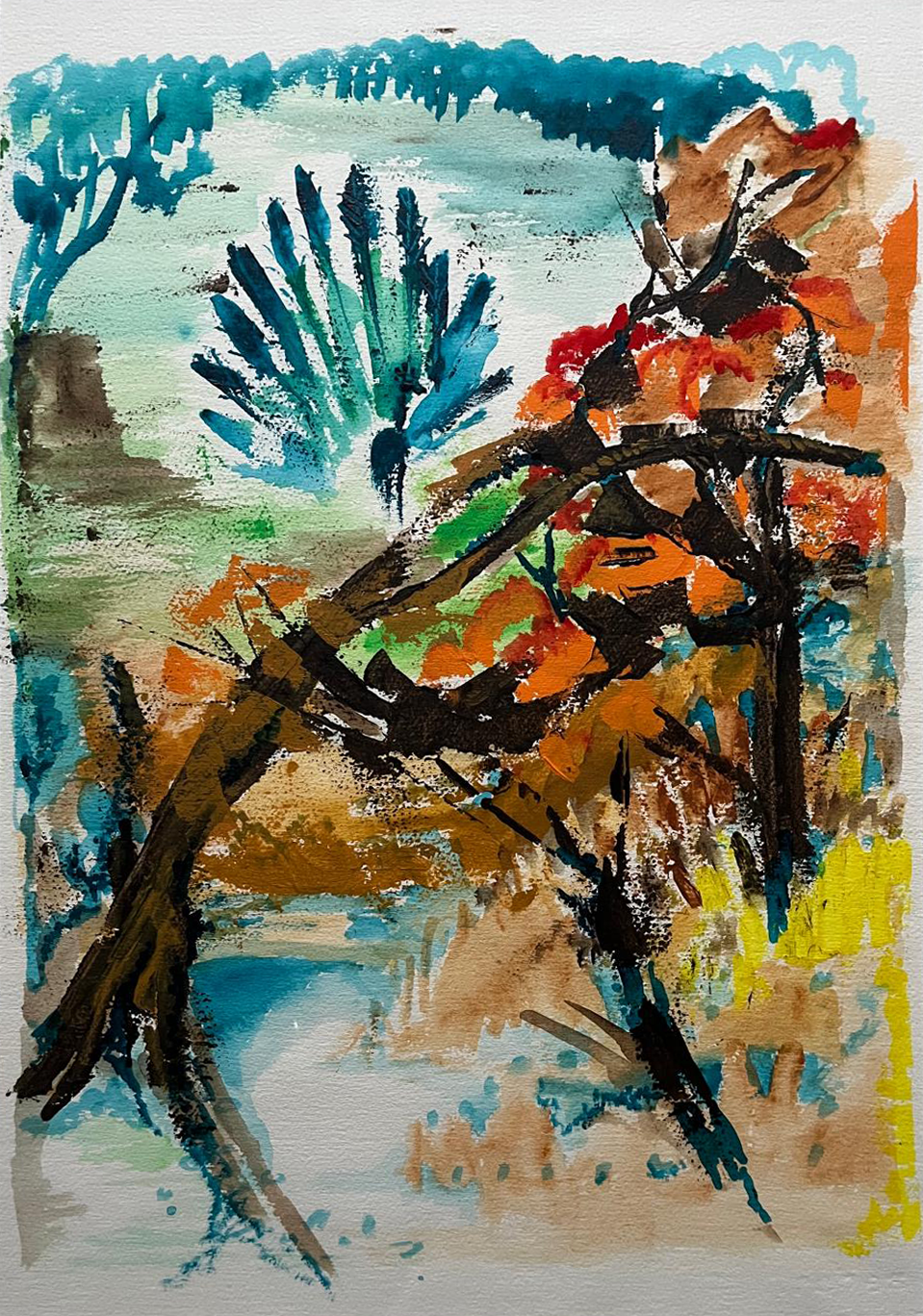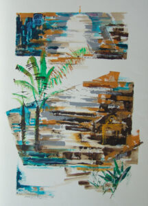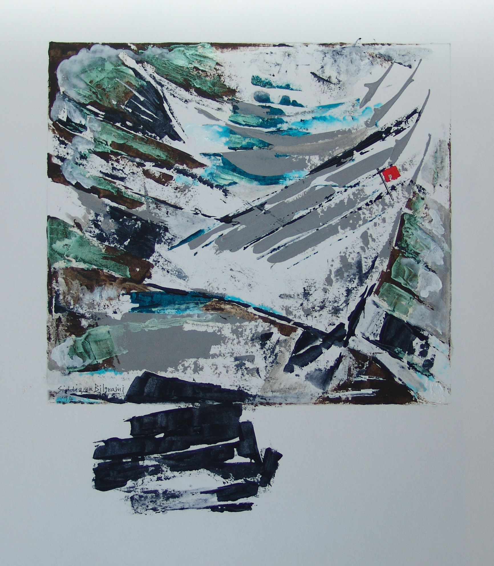Seen and unseen, imagined and visualized, spring forth semi-abstract forms akin to landscapes. The ‘print’ format continued here, containing the imagery in self-imposed boundaries and then spilling out here and there for special effects. These paintings are in acrylics on paper. The subject matter varies from ‘ spiritualistic’ where ascending stairs and pathways lead one up somewhere, or there is an examination of ‘Nature’ by cross-section, front and side-views, leading onto a logical conclusion. Drops of blood, tears and strikes sometimes combine with landscapes. Sometimes there is poetic portrayal of Nature itself.